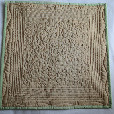 Another reason for using the interfacing was because no matter how even you cut your pieces, satin moves around a lot so this method helped them keep their shape. I was stuck on how to quilt it and what colour thread to use so opted for a clear nylon thread. In the center where the fabric is patterned it was difficult to see where I was going but over all I'm pretty pleased with it.